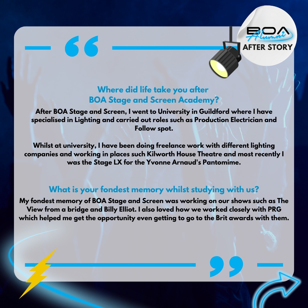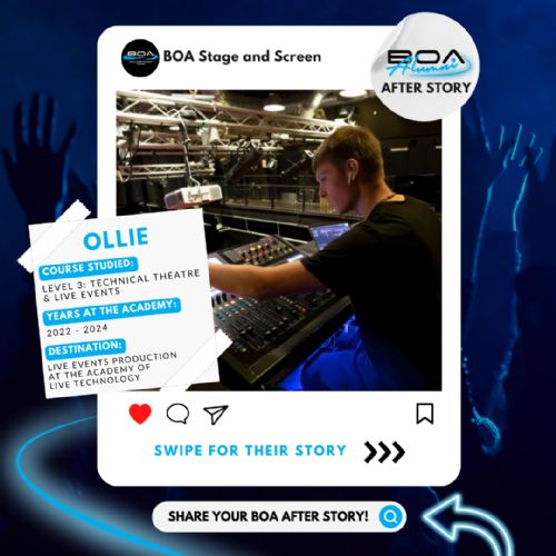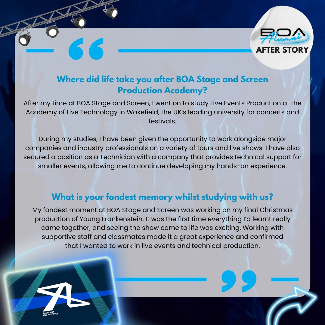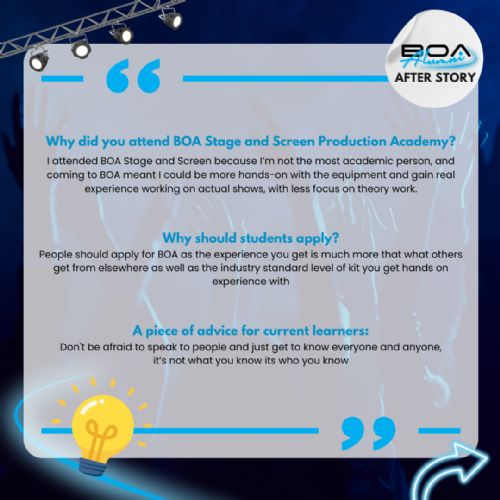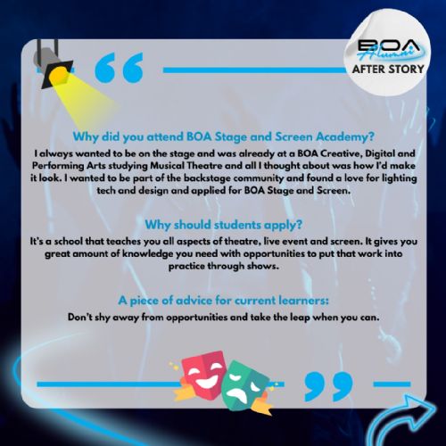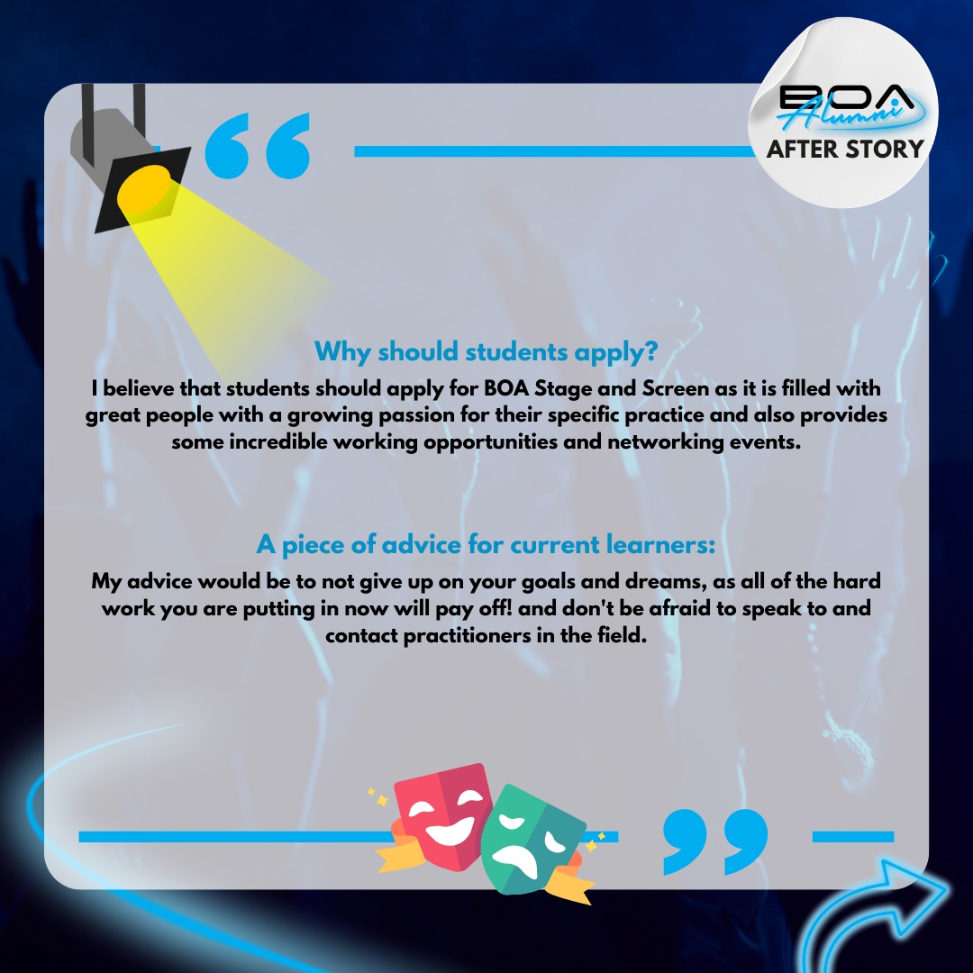 Are you a former student of BOA Stage & Screen Production Academy? We want to hear from you! Whether you're working in the industry, pursuing further education, or carving your own creative path, your journey can inspire the next generation.