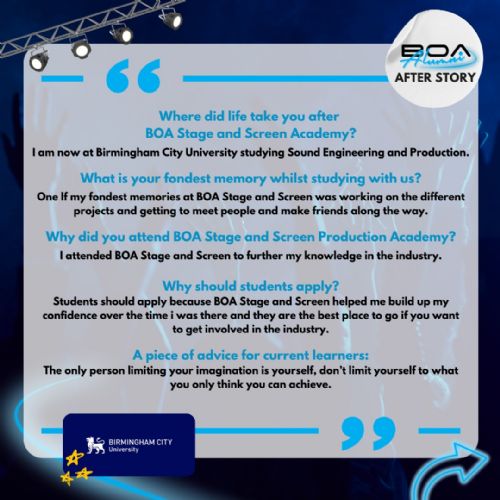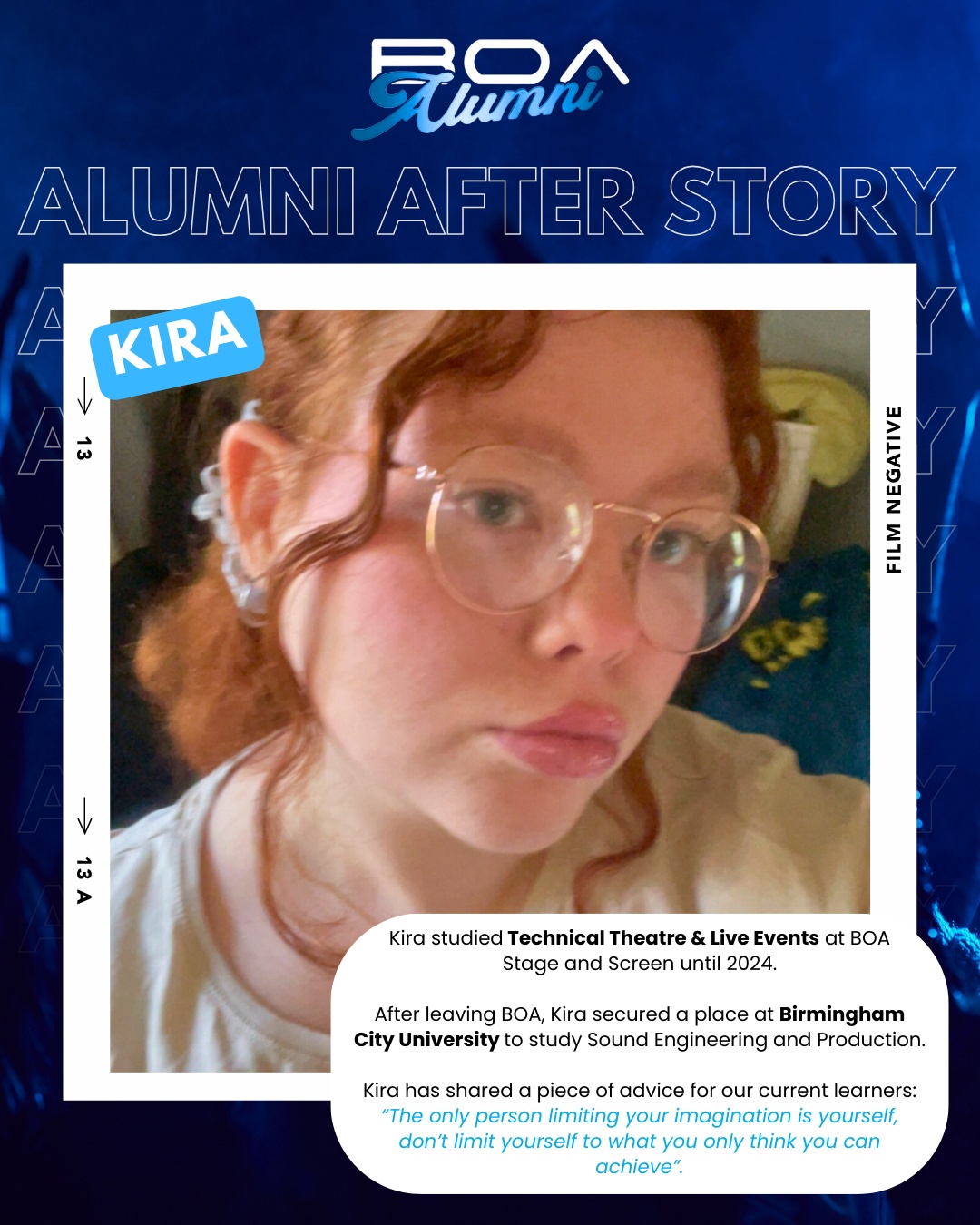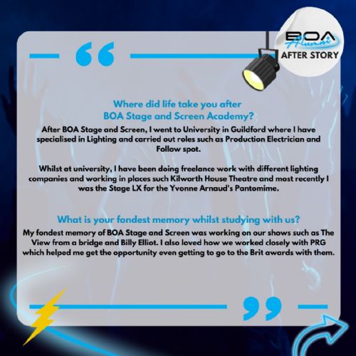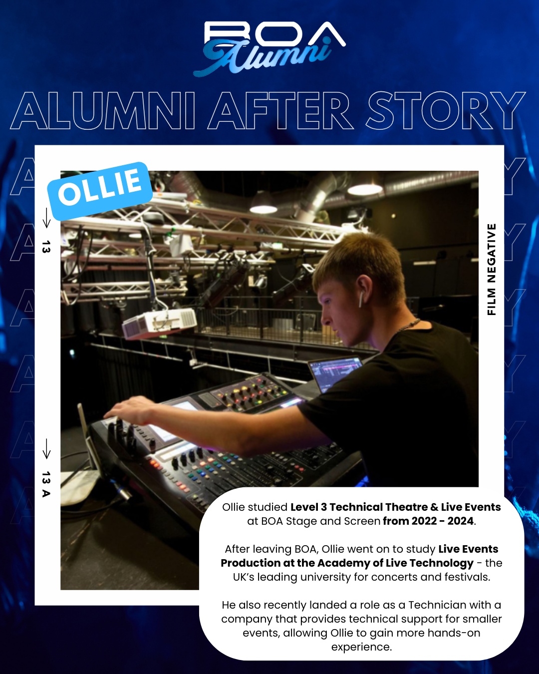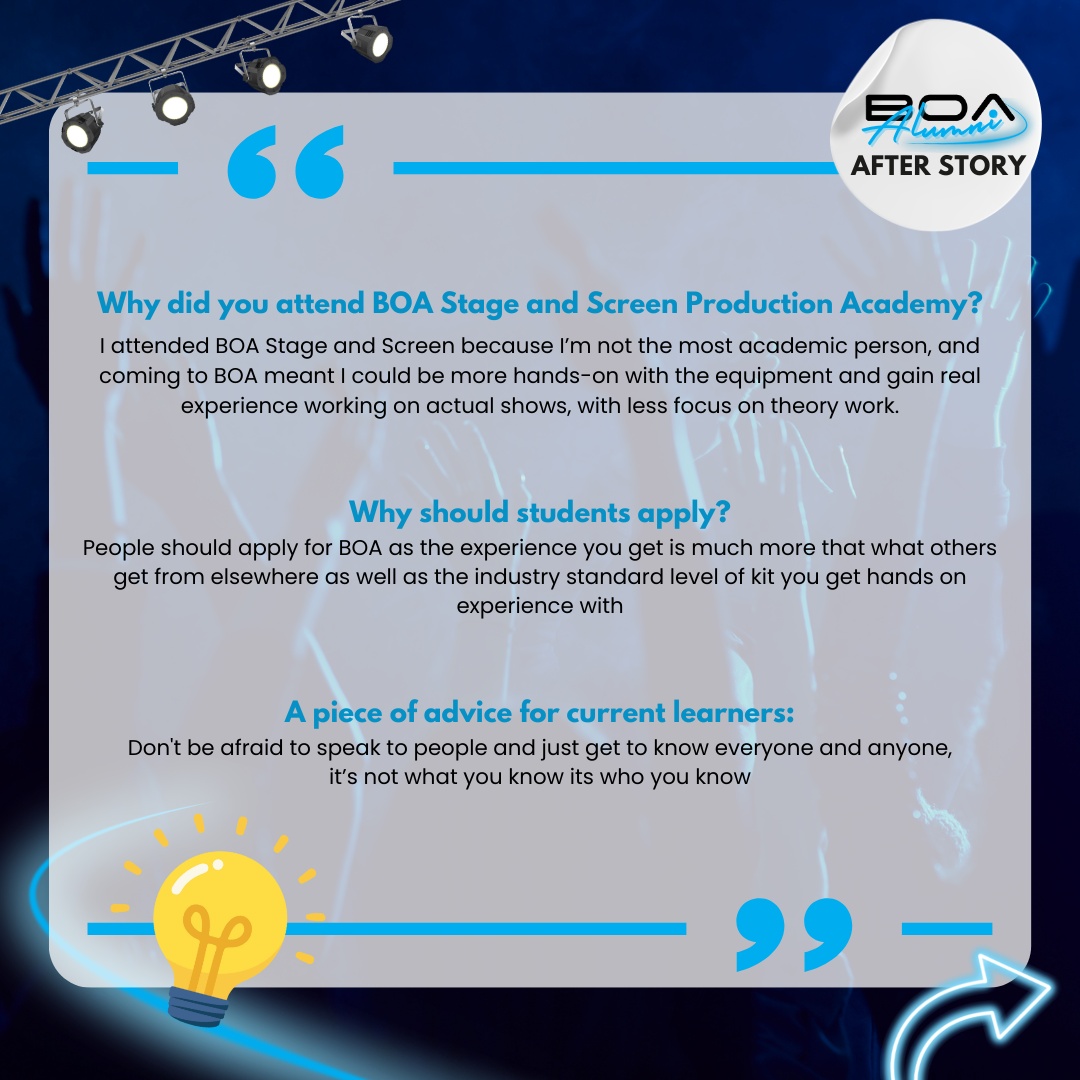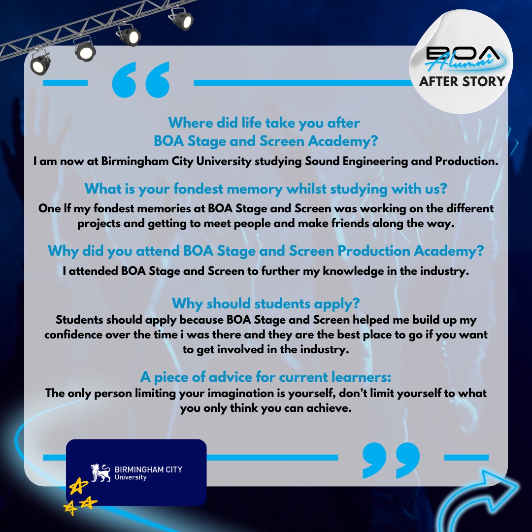 Are you a former student of BOA Stage & Screen Production Academy? We want to hear from you! Whether you're working in the industry, pursuing further education, or carving your own creative path, your journey can inspire the next generation.