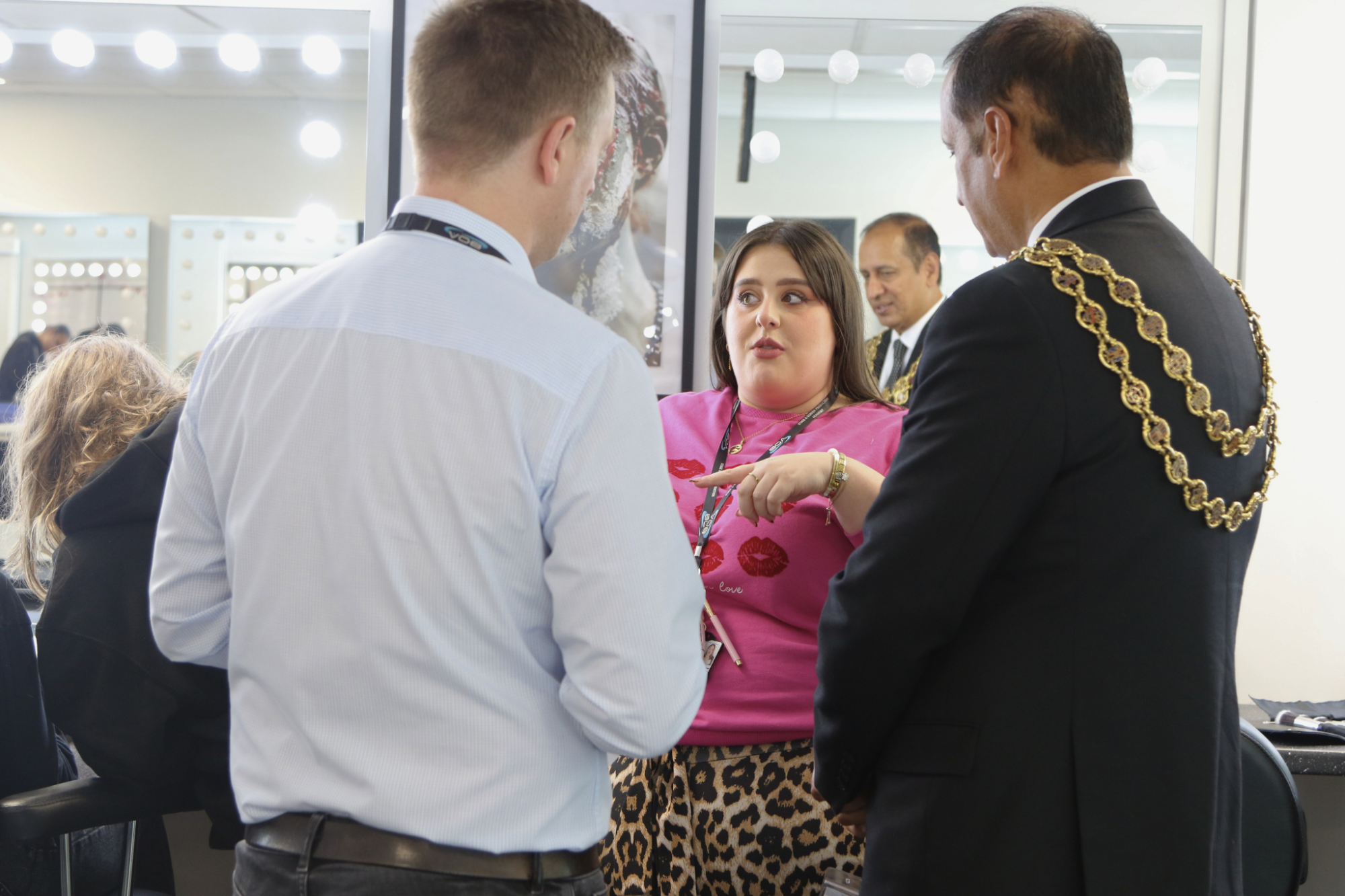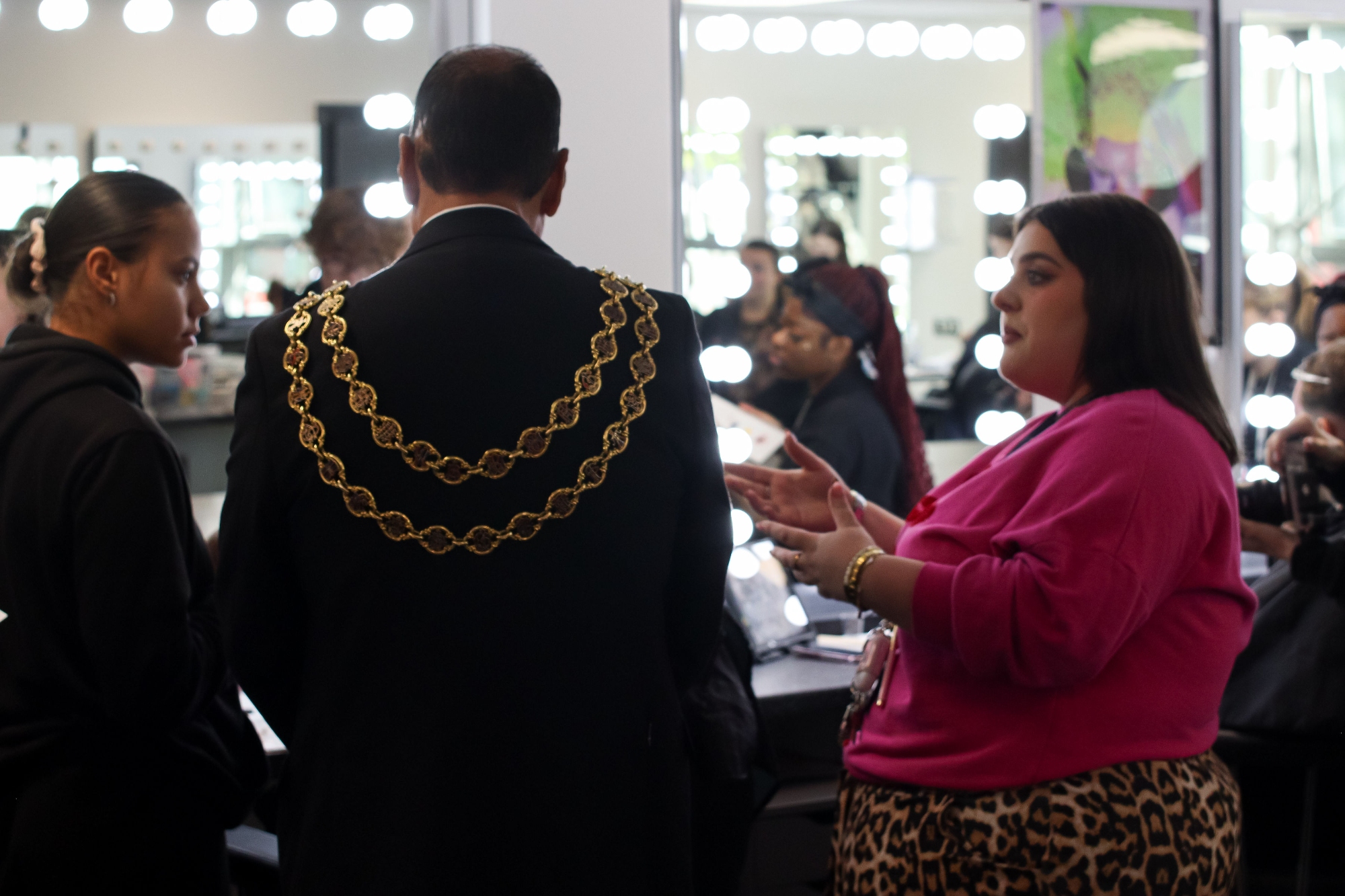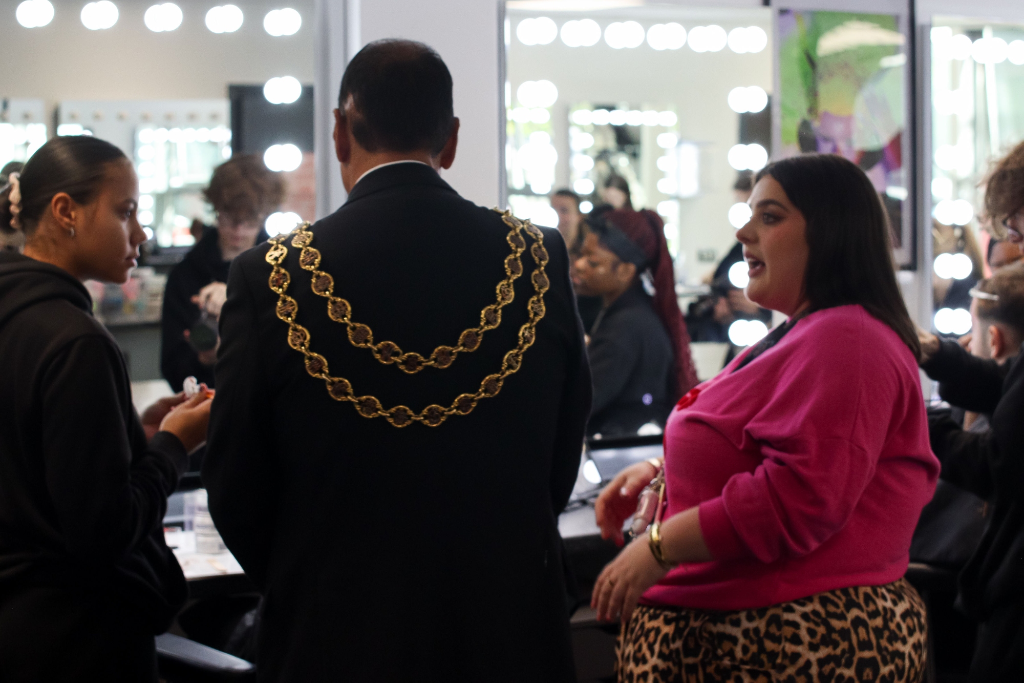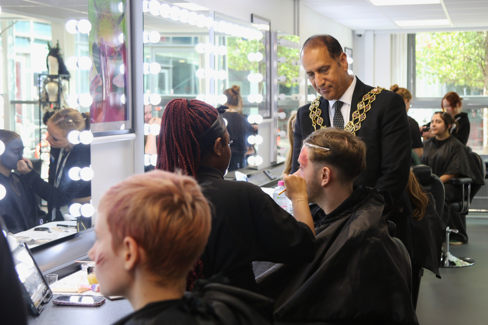 During the tour, the Lord Mayor enjoyed an immersive behind-the-scenes journey through the Academy’s specialist departments. In the TV & Film department, he watched a live filming of student-led interviews and the fast-paced editing process from the gallery. In Hair & Make-Up, he saw students transform into goblins as well as master intricate 1960s beehives. The Lighting & Sound department impressed with an exciting light show, while Set, Props & Costume showcased their stunning progress on costumes and designs for Cinderella, which will be staged at The Old Rep this Winter. Meanwhile, Writing, Directing and Screen Craft students captivated visitors with a session of live improvisation, highlighting the Academy’s focus on collaboration and creativity across all disciplines.