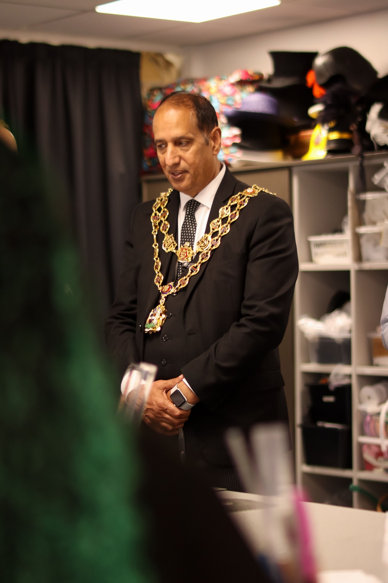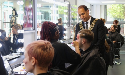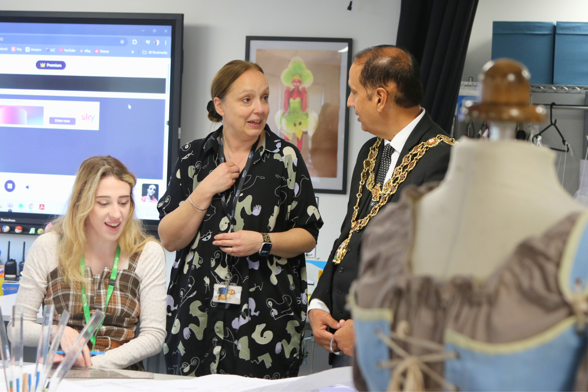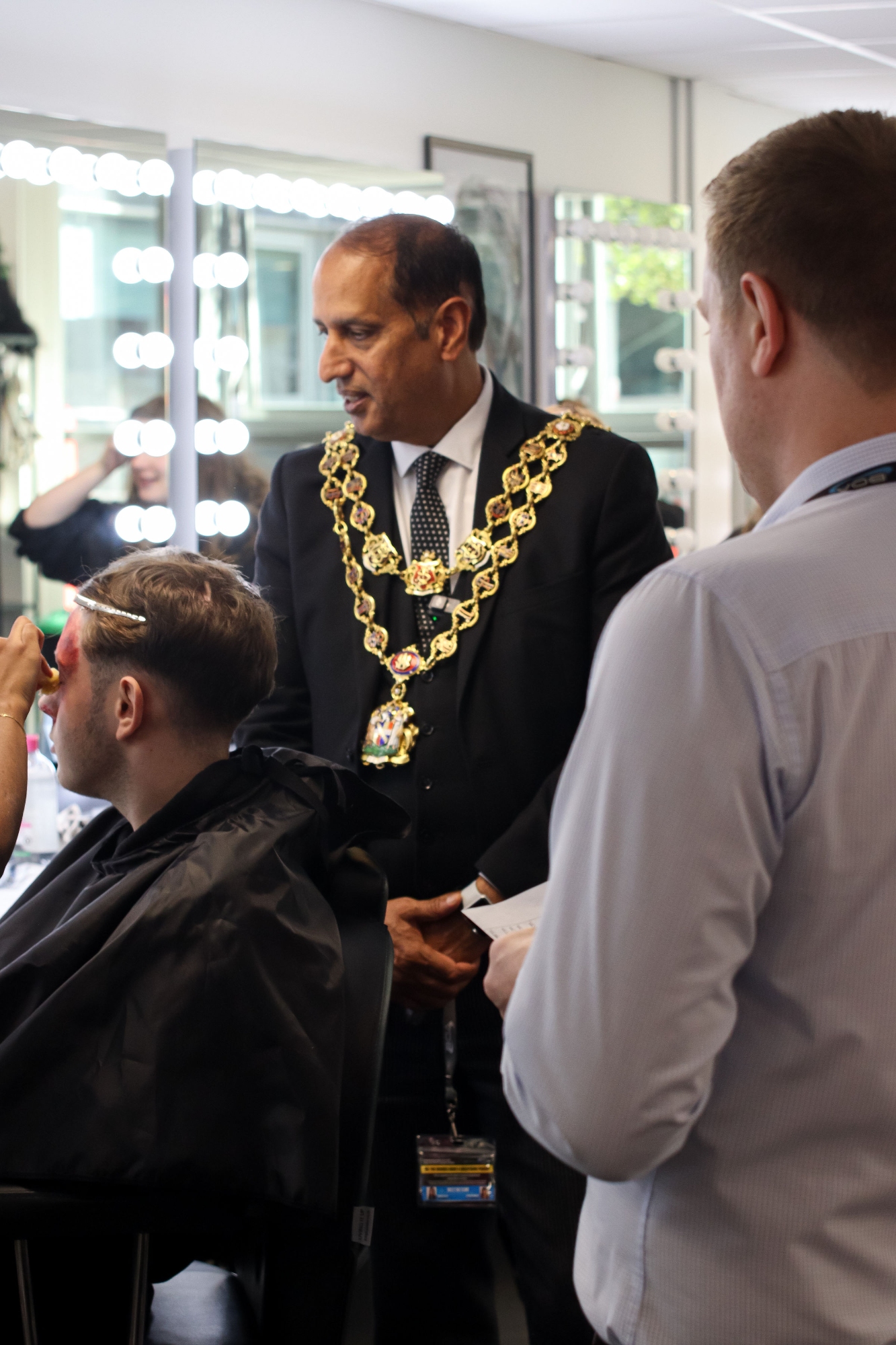 During the tour, the Lord Mayor enjoyed an immersive behind-the-scenes journey through the Academy’s specialist departments. In the TV & Film department, he watched a live filming of student-led interviews and the fast-paced editing process from the gallery. In Hair & Make-Up, he saw students transform into goblins as well as master intricate 1960s beehives. The Lighting & Sound department impressed with an exciting light show, while Set, Props & Costume showcased their stunning progress on costumes and designs for Cinderella, which will be staged at The Old Rep this Winter. Meanwhile, Writing, Directing and Screen Craft students captivated visitors with a session of live improvisation, highlighting the Academy’s focus on collaboration and creativity across all disciplines.